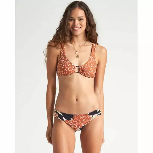 A paradise play on neutrals, lava tones reverse to a sunbaked tan in the Shadow Play Tri bikini. Printed with dark tropicals on one side and printed Hawaiian earth tones on the other, the reversible cropped tank style top features scoop necklines at the front and back and a matte ring at the center front. Wear it in the water, under tops, or to the studio.