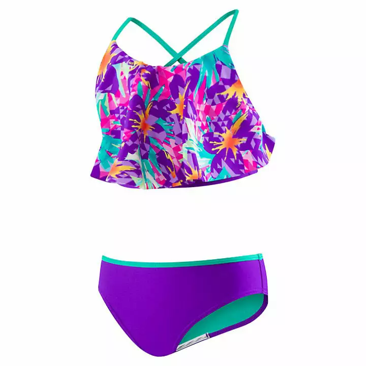 - Details include sporty stay-put straps, a pretty ruffled bodice and silicone grippers at the leg opening for no wedgie worries.
