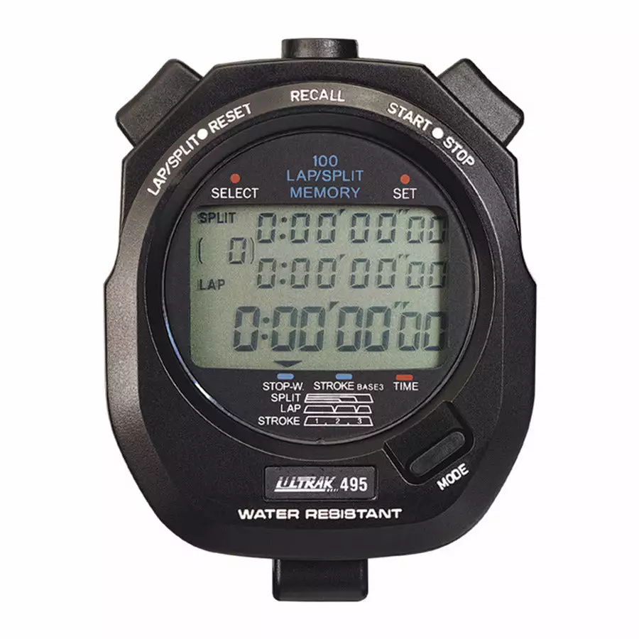 The Ultrax 495 Stopwatch is our most popular selling coaches stopwatch.The Ultrax 495 is a 100 dual split memory stopwatch with stroke frequency. Featuring lap and cumulative split capabilities, a large 3 row display and water resistance the Ultrax 495 Stopwatch is trusted by hundreds of swim coaches. Ultrak’s stopwatches are powered by lithium battery, keeping your timer running strong for up to five years.